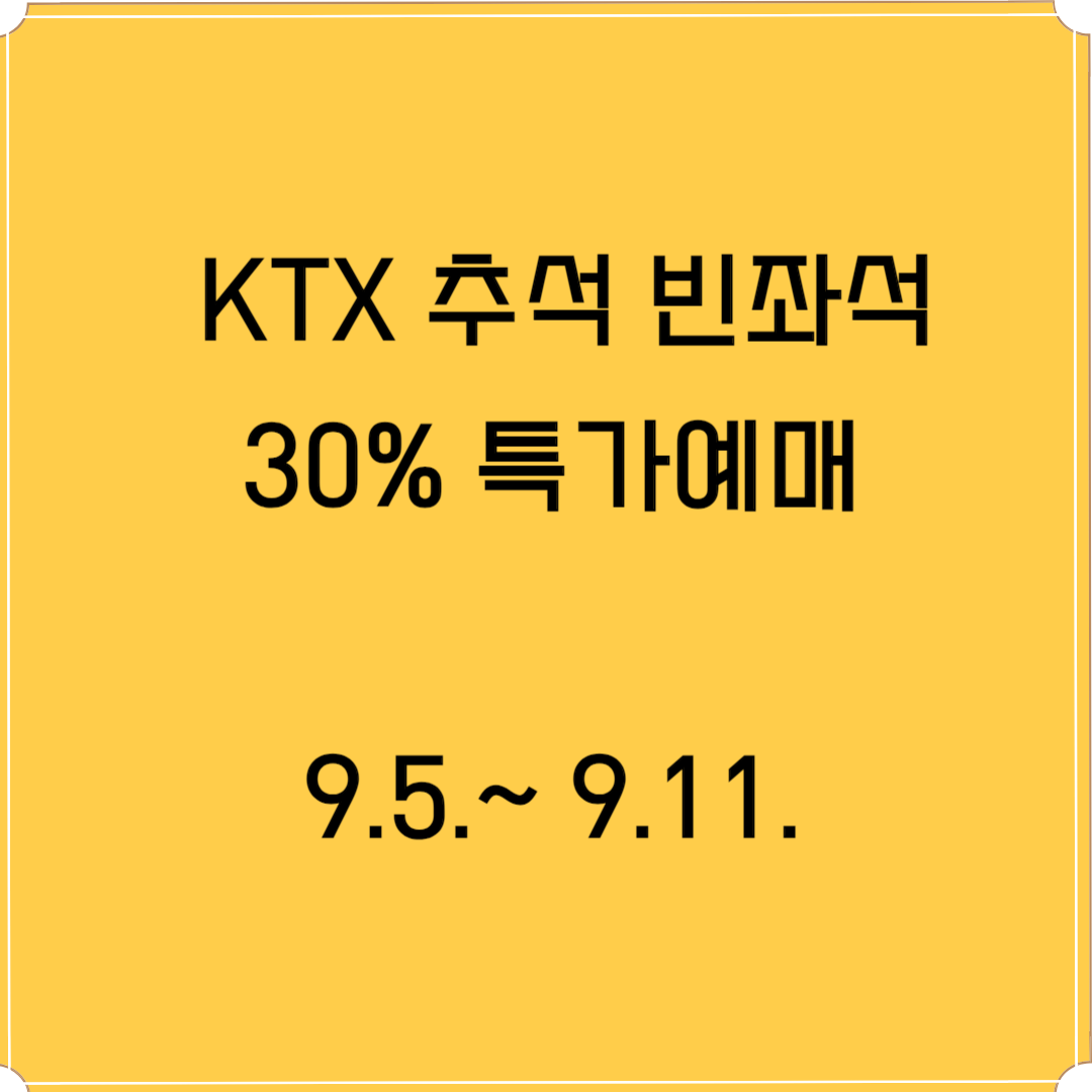 9월 5일~9월 11일까지 KTX 추석 빈좌석을 30% 특가 할인으로 예매할 수 있습니다.