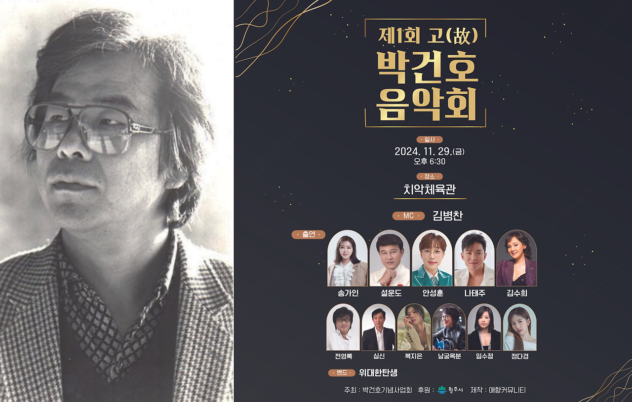 이 음악회는 고 박건호 작사가의 업적을 기리기 위해 마련된 자리로, 박건호 작사는 한국 대중음악의 발전에 큰 기여를 한 인물로, 그의 노래는 지금도 많은 사랑을 받고 있습니다.