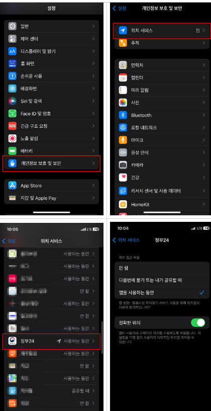 개인정보 보호 및 보안 메뉴 설정에서 위치 서비스를 클릭