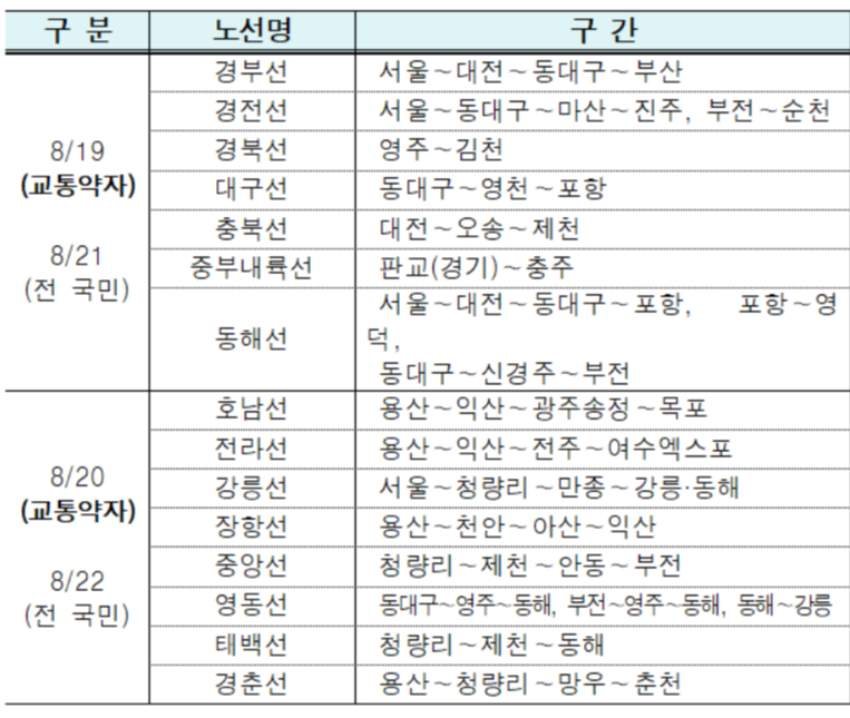 8월 19일~20일 이틀간은 경로·장애인·국가유공자(교통지원대상) 등 교통약자의 별도 예매