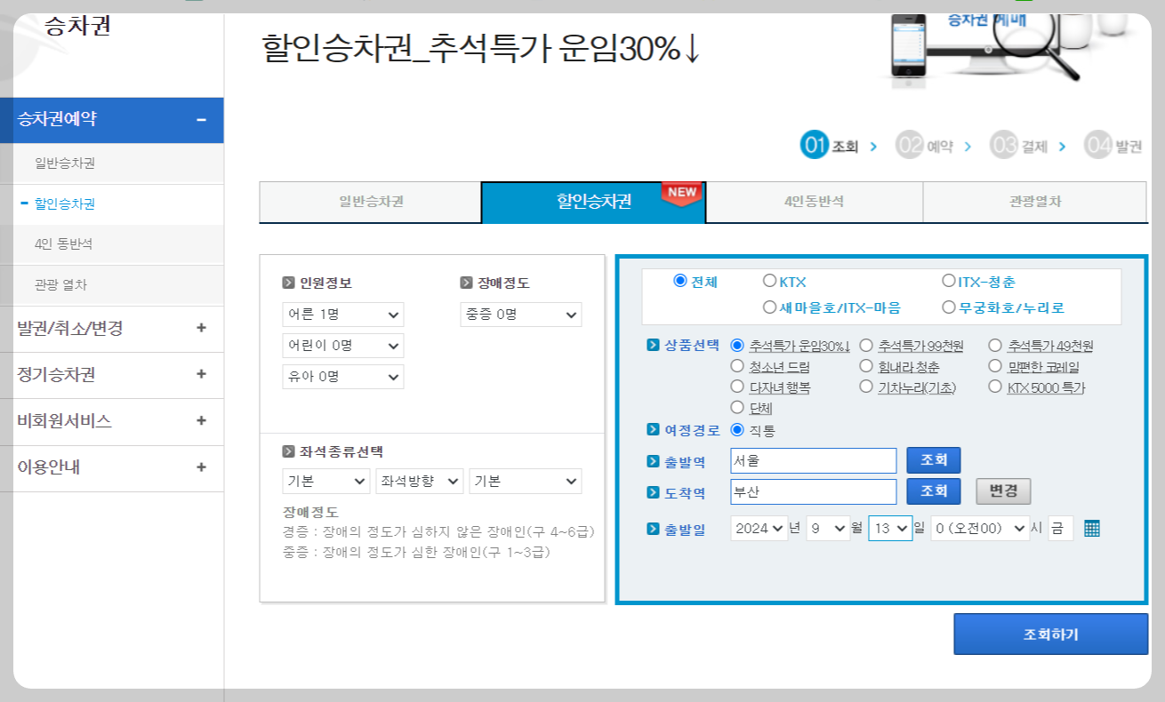 KTX 홈페이지 → 할인승차권 → 24 추석 KTX 특가 → 운임 30% ↓